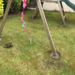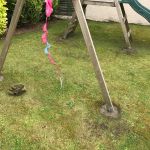Just before my daughters 2nd birthday, we bought a swing set for the garden from Dunster House. It seemed like excellent value, and other than having to get it delivered to a friendly Dive Centre in Eyemouth (long story, but it was free delivery there and about 1/4 the cost of the swing set to get it delivered at home) it’s been pretty good. It was easy enough to construct, and at the time I decided just to use the metal posts hammered into the ground, rather than concrete in, as she was kind of light and we didn’t have many visitors using it at the same time. Earlier this week all that changed when we had four children (from about 4-10) playing on it and my partner holding it down as it was moving so much!